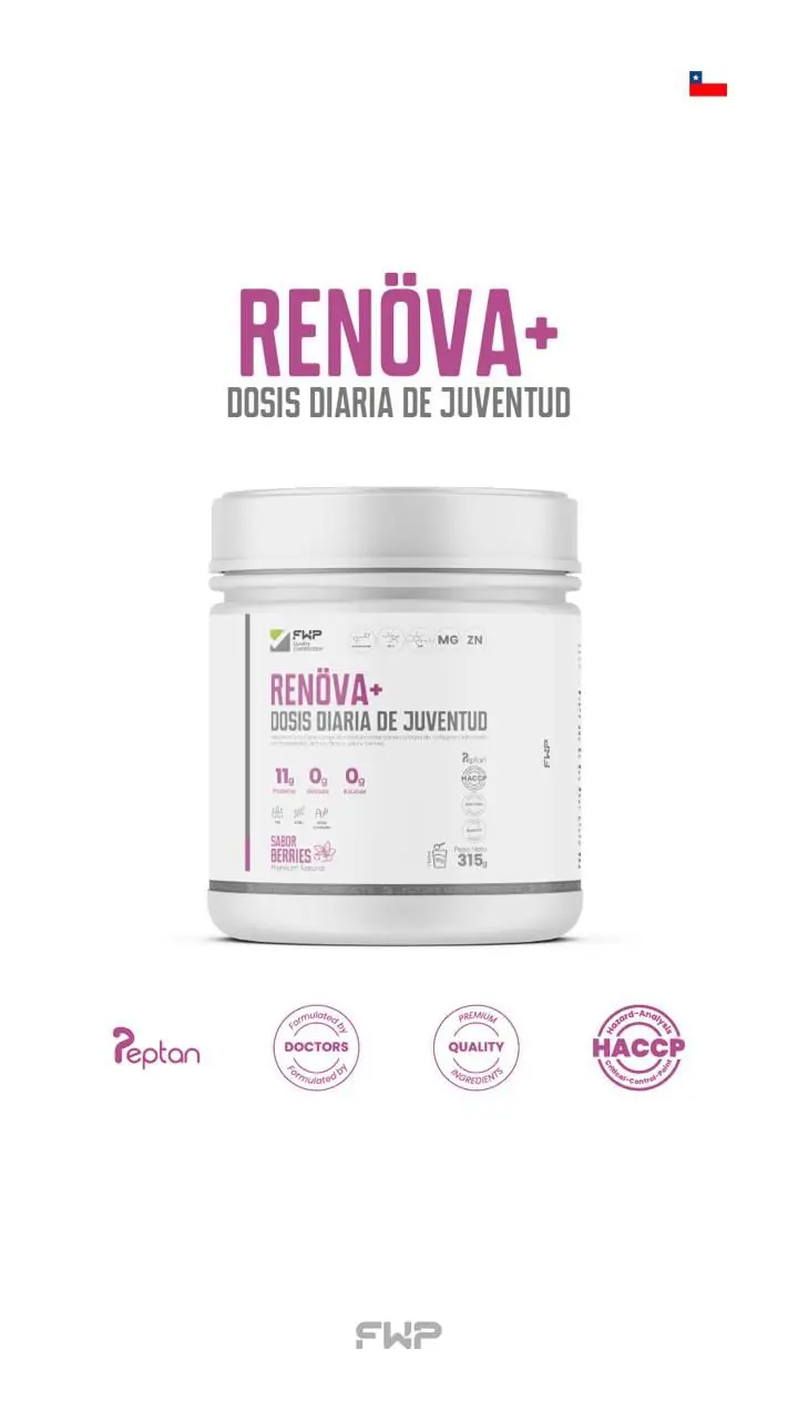 RENÖVA, es mucho más que un colágeno: es tu ritual diario para revitalizar tu piel, cabello, uñas, articulaciones y sistema inmune. Su fórmula contiene bio-péptidos activos de colágeno hidrolizado Peptan®️, reconocidos a nivel mundial por su alta absorción y efectividad.